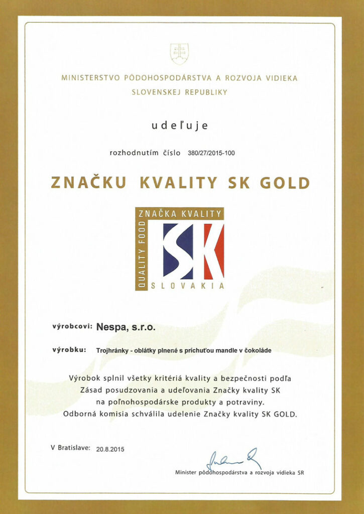 Spločnosť je od roku 2015 neustále držiteľom značiek kvality SK a SK Gold za výnimočnosť výrobkov na slovenskom trhu. Niekoľkokrát ocenenou kvalitou našich výrobkov sa odlišujeme od konkurencie.
